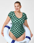 Green Check Short Sleeve Modest One-Piece Swimsuit