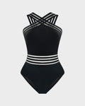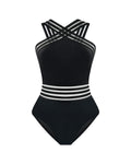 Striped Mesh Insert Cross-Over Halter Neck Swimsuit